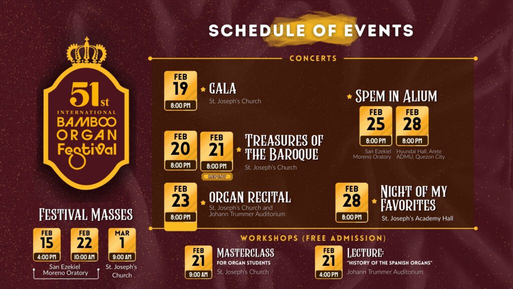 The opening gala presents an evening of music to mark the beginning of the 51st year of the Festival, featuring organist Andrés Cea Galán, conductor Eudenice Palaruan, soloist Toshiyuki Shibata, the Manila Baroque Ensemble, and the Ateneo de Manila College Glee Club